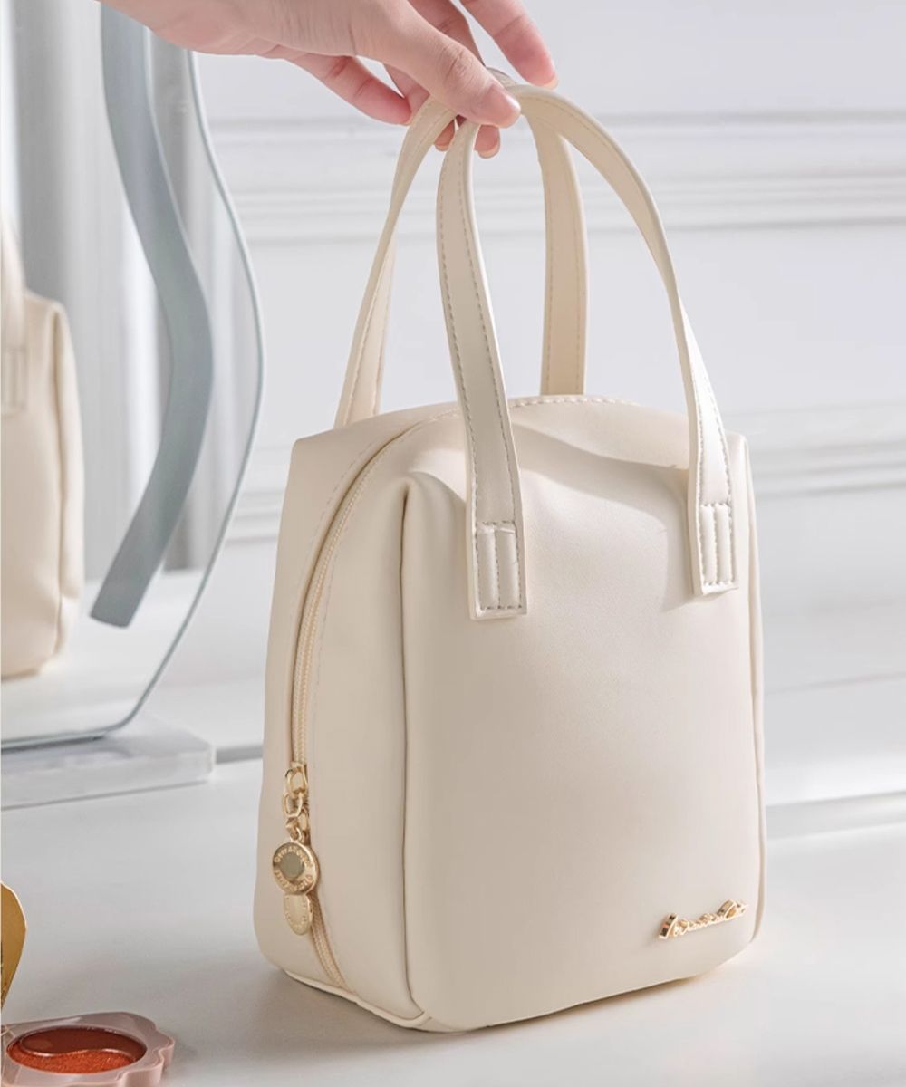 大きく開いて中身が一目瞭然で整理整頓しやすい、しっかり自立する縦型の韓国風新作化粧品収納バッグ